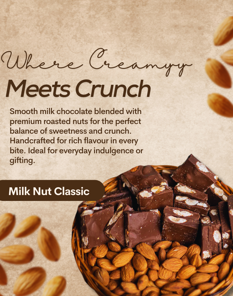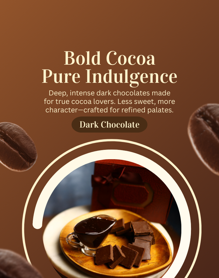 Handcrafted chocolates made with real cocoa, premium nuts, and balanced sweetness — fresh, smooth, and made to satisfy.